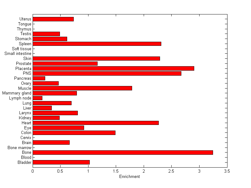 The expression level is normalized with tissue-library size. Each value for a gene in a tissue is a ratio of observed ESTs to the expected one in this tissue. The expected number of ESTs is the product of total ESTs of the gene and the fraction of total ESTs in the tissue among all ESTs in 30 tissues.