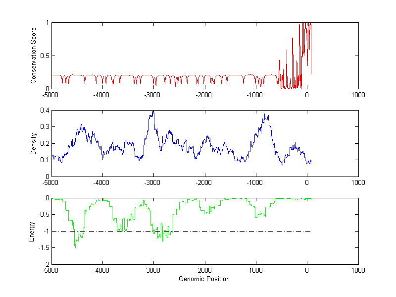 The energy profile (green curve) is about energy for module detection based on TF interaction. The positions with energy less than -1 indicate the existence of CRMs.