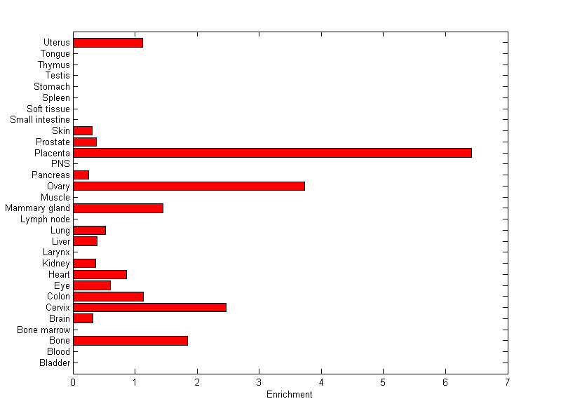 The expression level is normalized with tissue-library size. Each value for a gene in a tissue is a ratio of observed ESTs to the expected one in this tissue. The expected number of ESTs is the product of total ESTs of the gene and the fraction of total ESTs in the tissue among all ESTs in 30 tissues.