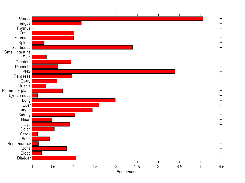 The expression level is normalized with tissue-library size. Each value for a gene in a tissue is a ratio of observed ESTs to the expected one in this tissue. The expected number of ESTs is the product of total ESTs of the gene and the fraction of total ESTs in the tissue among all ESTs in 30 tissues.
