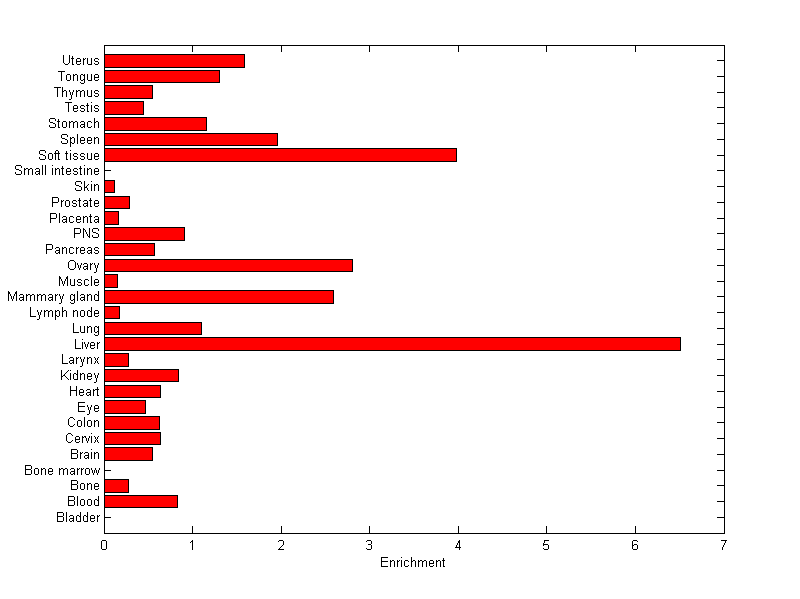 The expression level is normalized with tissue-library size. Each value for a gene in a tissue is a ratio of observed ESTs to the expected one in this tissue. The expected number of ESTs is the product of total ESTs of the gene and the fraction of total ESTs in the tissue among all ESTs in 30 tissues.