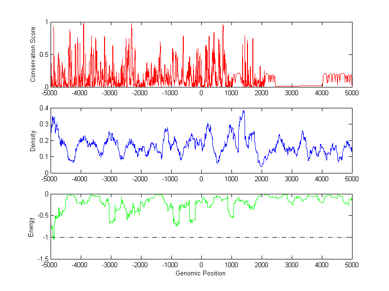 The energy profile (green curve) is about energy for module detection based on TF interaction. The positions with energy less than -1 indicate the existence of CRMs.
