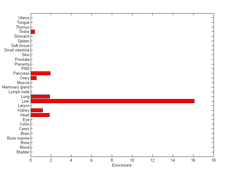The expression level is normalized with tissue-library size. Each value for a gene in a tissue is a ratio of observed ESTs to the expected one in this tissue. The expected number of ESTs is the product of total ESTs of the gene and the fraction of total ESTs in the tissue among all ESTs in 30 tissues.