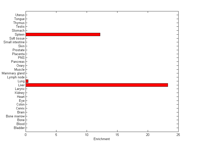 The expression level is normalized with tissue-library size. Each value for a gene in a tissue is a ratio of observed ESTs to the expected one in this tissue. The expected number of ESTs is the product of total ESTs of the gene and the fraction of total ESTs in the tissue among all ESTs in 30 tissues.