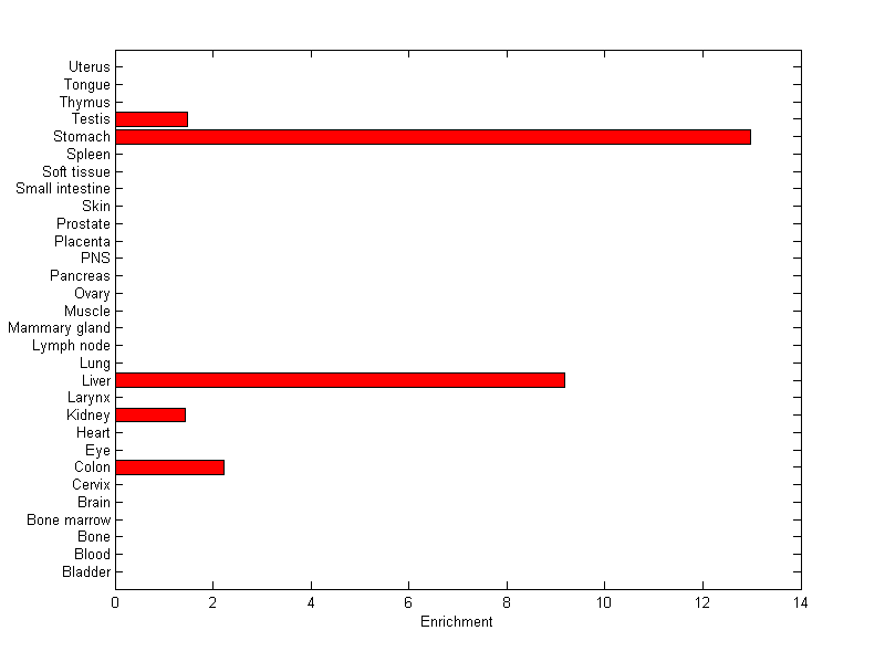 About the profile: The expression level is normalized with tissue-library size. Each value for a gene in a tissue is a ratio of observed ESTs to the expected one in this tissue. The expected number of ESTs is the product of total ESTs of the gene and the fraction of total ESTs in the tissue among all ESTs in 30 tissues. Summary: This gene is preferentially expressed in [liver, stomach] Download: |