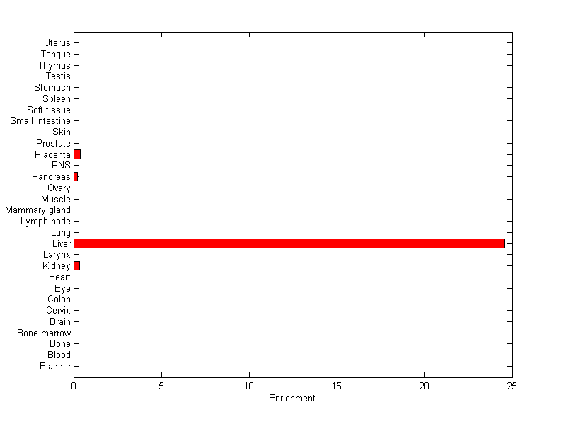 About the profile: The expression level is normalized with tissue-library size. Each value for a gene in a tissue is a ratio of observed ESTs to the expected one in this tissue. The expected number of ESTs is the product of total ESTs of the gene and the fraction of total ESTs in the tissue among all ESTs in 30 tissues. Summary: This gene is preferentially expressed in [liver] Download: |