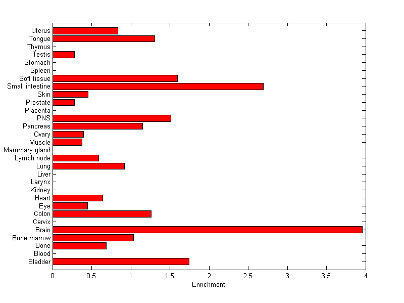 The expression level is normalized with tissue-library size. Each value for a gene in a tissue is a ratio of observed ESTs to the expected one in this tissue. The expected number of ESTs is the product of total ESTs of the gene and the fraction of total ESTs in the tissue among all ESTs in 30 tissues.