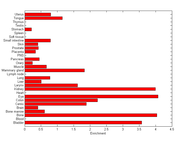 The expression level is normalized with tissue-library size. Each value for a gene in a tissue is a ratio of observed ESTs to the expected one in this tissue. The expected number of ESTs is the product of total ESTs of the gene and the fraction of total ESTs in the tissue among all ESTs in 30 tissues.