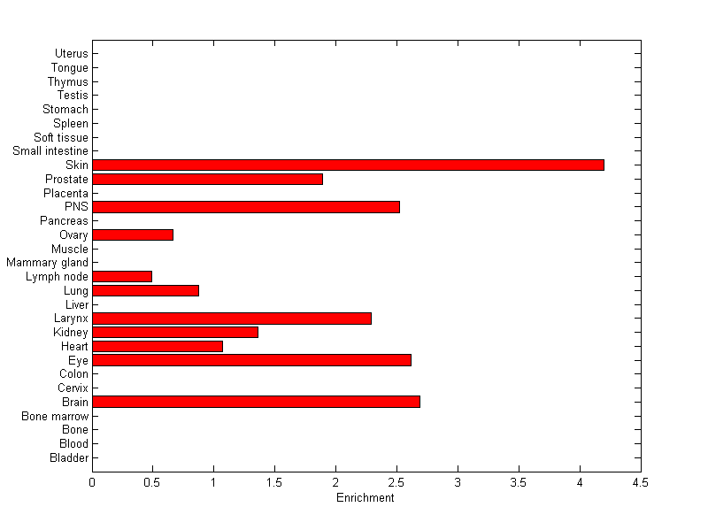 The expression level is normalized with tissue-library size. Each value for a gene in a tissue is a ratio of observed ESTs to the expected one in this tissue. The expected number of ESTs is the product of total ESTs of the gene and the fraction of total ESTs in the tissue among all ESTs in 30 tissues.
