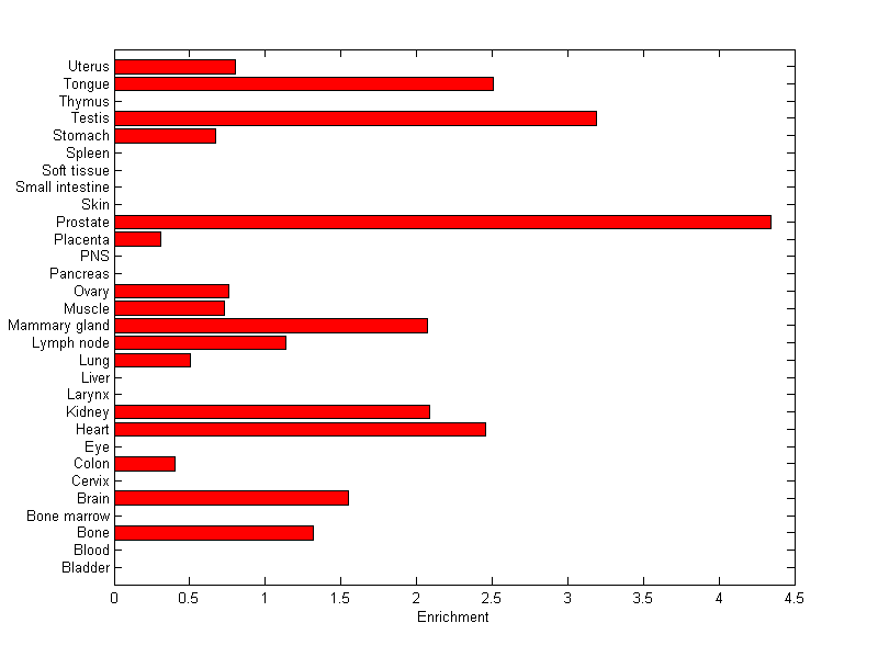 The expression level is normalized with tissue-library size. Each value for a gene in a tissue is a ratio of observed ESTs to the expected one in this tissue. The expected number of ESTs is the product of total ESTs of the gene and the fraction of total ESTs in the tissue among all ESTs in 30 tissues.