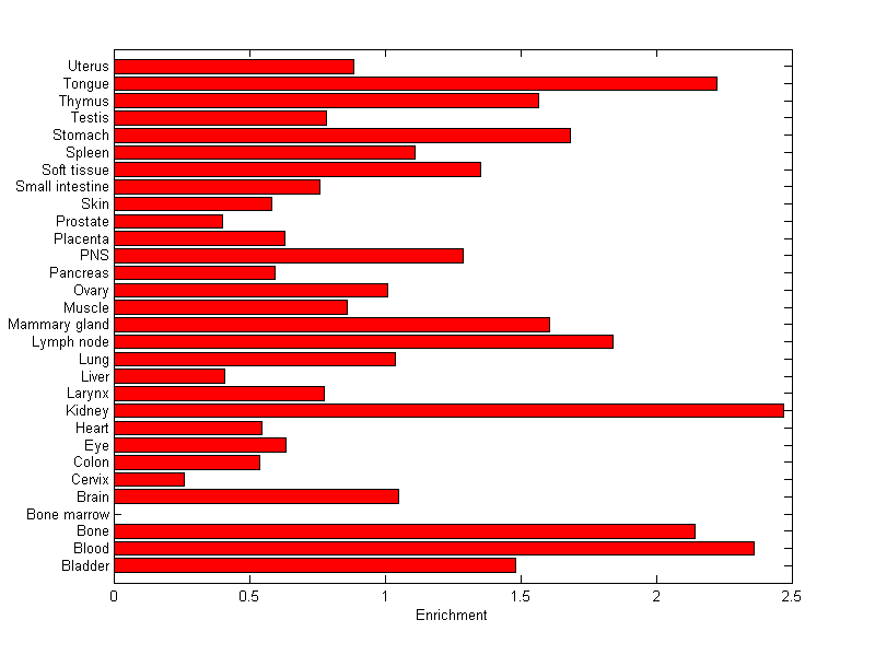 The expression level is normalized with tissue-library size. Each value for a gene in a tissue is a ratio of observed ESTs to the expected one in this tissue. The expected number of ESTs is the product of total ESTs of the gene and the fraction of total ESTs in the tissue among all ESTs in 30 tissues.