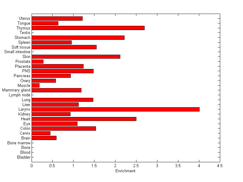 The expression level is normalized with tissue-library size. Each value for a gene in a tissue is a ratio of observed ESTs to the expected one in this tissue. The expected number of ESTs is the product of total ESTs of the gene and the fraction of total ESTs in the tissue among all ESTs in 30 tissues.