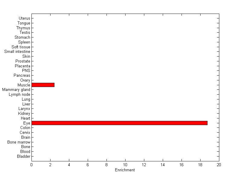 The expression level is normalized with tissue-library size. Each value for a gene in a tissue is a ratio of observed ESTs to the expected one in this tissue. The expected number of ESTs is the product of total ESTs of the gene and the fraction of total ESTs in the tissue among all ESTs in 30 tissues.