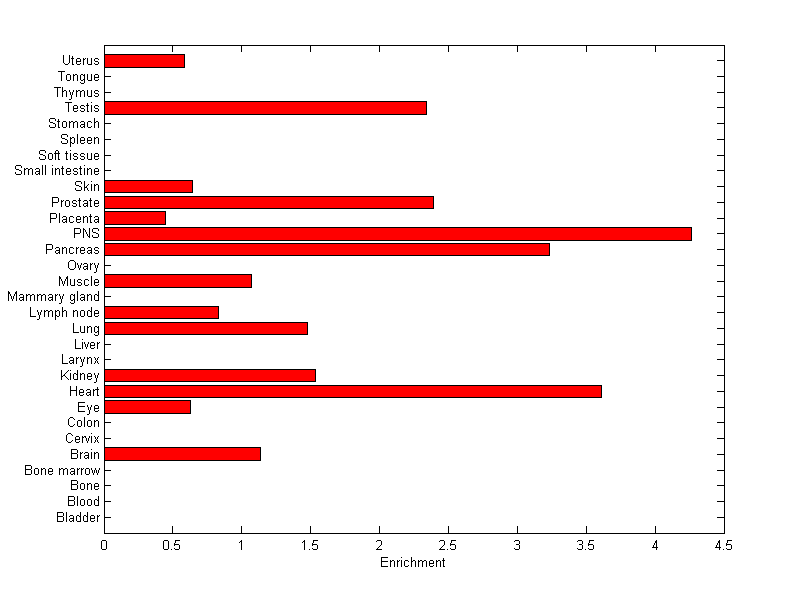 The expression level is normalized with tissue-library size. Each value for a gene in a tissue is a ratio of observed ESTs to the expected one in this tissue. The expected number of ESTs is the product of total ESTs of the gene and the fraction of total ESTs in the tissue among all ESTs in 30 tissues.