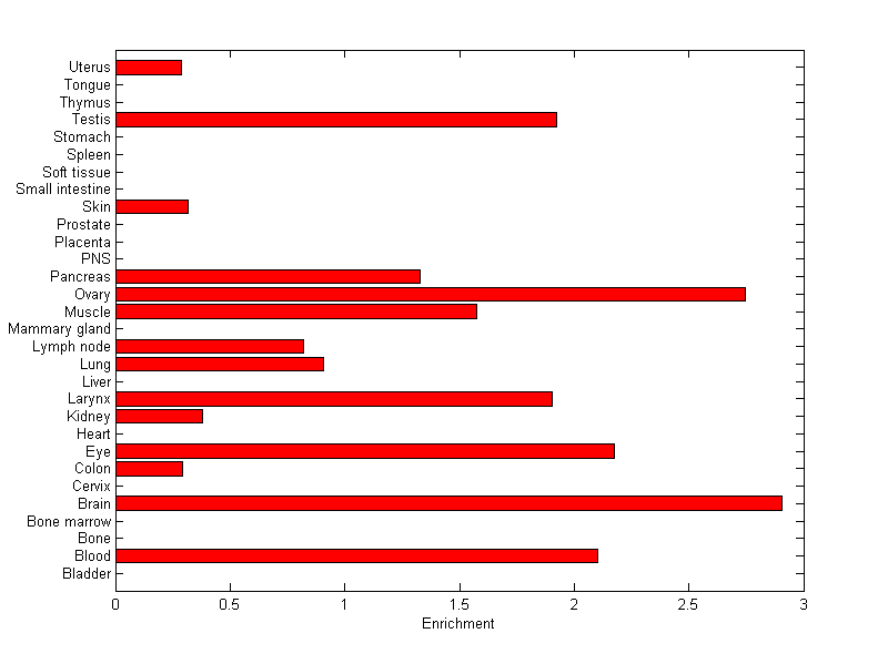 The expression level is normalized with tissue-library size. Each value for a gene in a tissue is a ratio of observed ESTs to the expected one in this tissue. The expected number of ESTs is the product of total ESTs of the gene and the fraction of total ESTs in the tissue among all ESTs in 30 tissues.
