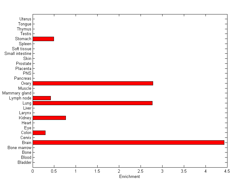 The expression level is normalized with tissue-library size. Each value for a gene in a tissue is a ratio of observed ESTs to the expected one in this tissue. The expected number of ESTs is the product of total ESTs of the gene and the fraction of total ESTs in the tissue among all ESTs in 30 tissues.