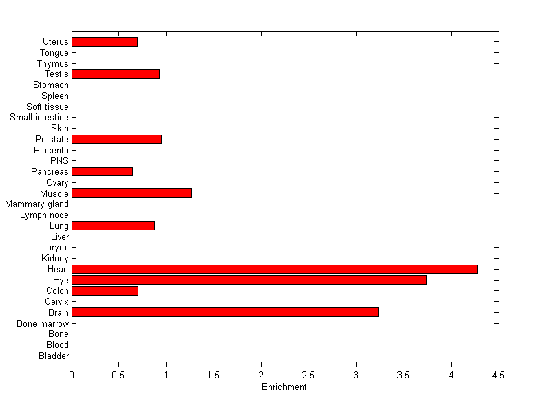 The expression level is normalized with tissue-library size. Each value for a gene in a tissue is a ratio of observed ESTs to the expected one in this tissue. The expected number of ESTs is the product of total ESTs of the gene and the fraction of total ESTs in the tissue among all ESTs in 30 tissues.