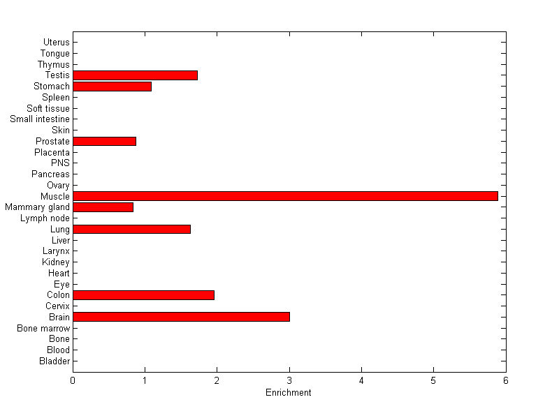 The expression level is normalized with tissue-library size. Each value for a gene in a tissue is a ratio of observed ESTs to the expected one in this tissue. The expected number of ESTs is the product of total ESTs of the gene and the fraction of total ESTs in the tissue among all ESTs in 30 tissues.