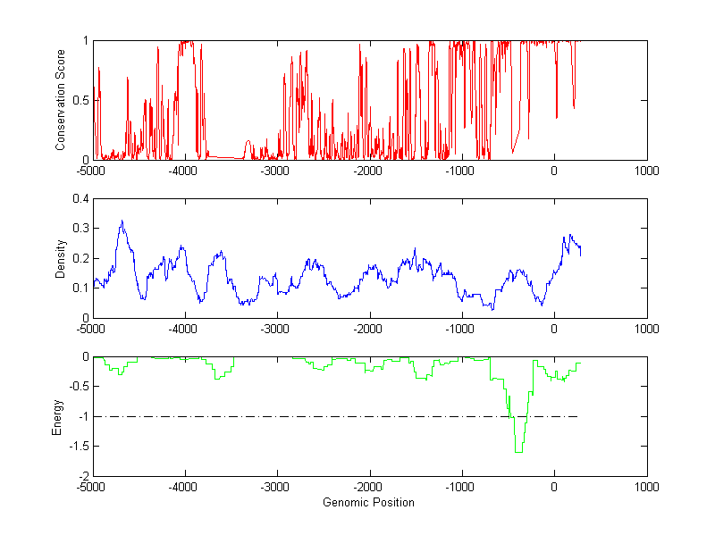 The energy profile (green curve) is about energy for module detection based on TF interaction. The positions with energy less than -1 indicate the existence of CRMs.