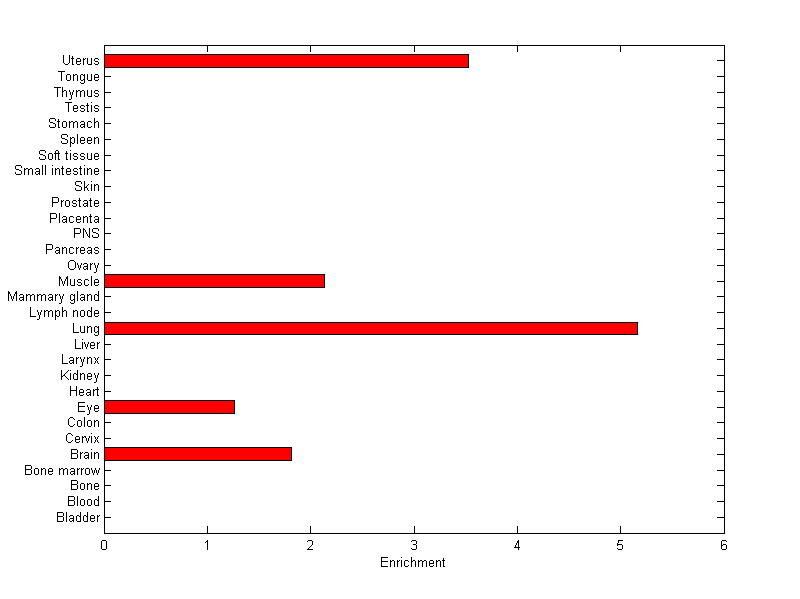 The expression level is normalized with tissue-library size. Each value for a gene in a tissue is a ratio of observed ESTs to the expected one in this tissue. The expected number of ESTs is the product of total ESTs of the gene and the fraction of total ESTs in the tissue among all ESTs in 30 tissues.