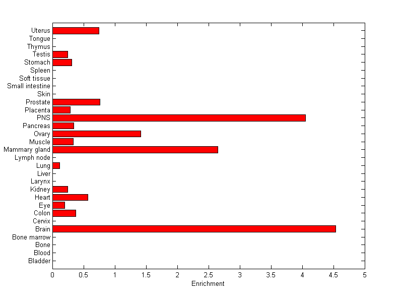 The expression level is normalized with tissue-library size. Each value for a gene in a tissue is a ratio of observed ESTs to the expected one in this tissue. The expected number of ESTs is the product of total ESTs of the gene and the fraction of total ESTs in the tissue among all ESTs in 30 tissues.