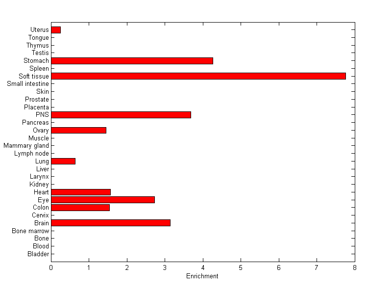 The expression level is normalized with tissue-library size. Each value for a gene in a tissue is a ratio of observed ESTs to the expected one in this tissue. The expected number of ESTs is the product of total ESTs of the gene and the fraction of total ESTs in the tissue among all ESTs in 30 tissues.