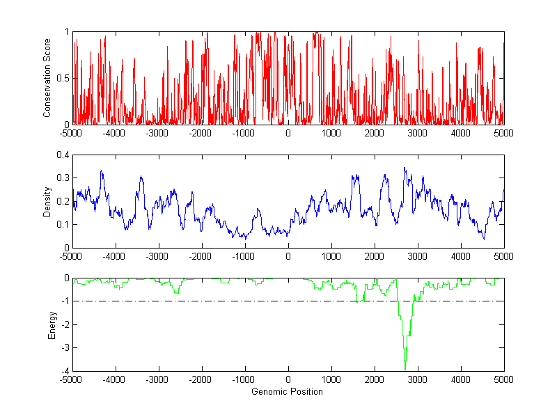 The energy profile (green curve) is about energy for module detection based on TF interaction. The positions with energy less than -1 indicate the existence of CRMs.