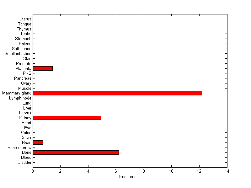 The expression level is normalized with tissue-library size. Each value for a gene in a tissue is a ratio of observed ESTs to the expected one in this tissue. The expected number of ESTs is the product of total ESTs of the gene and the fraction of total ESTs in the tissue among all ESTs in 30 tissues.