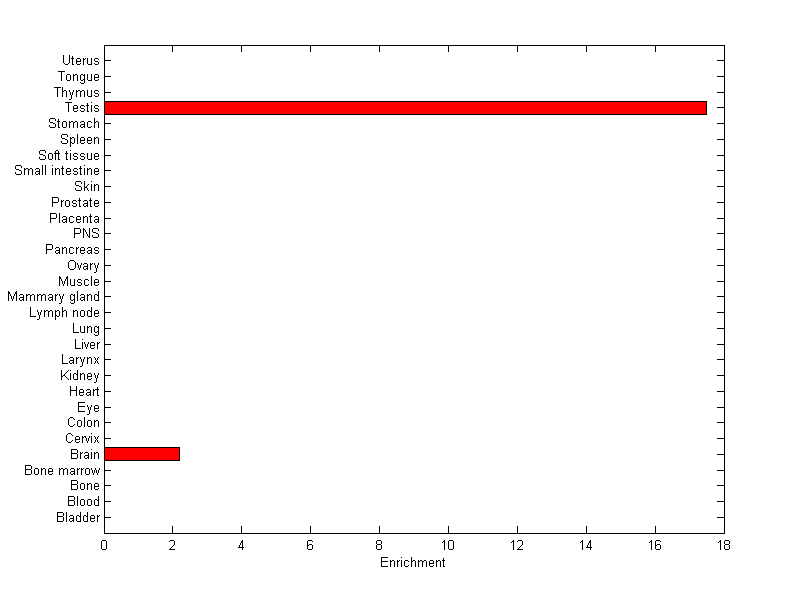 The expression level is normalized with tissue-library size. Each value for a gene in a tissue is a ratio of observed ESTs to the expected one in this tissue. The expected number of ESTs is the product of total ESTs of the gene and the fraction of total ESTs in the tissue among all ESTs in 30 tissues.