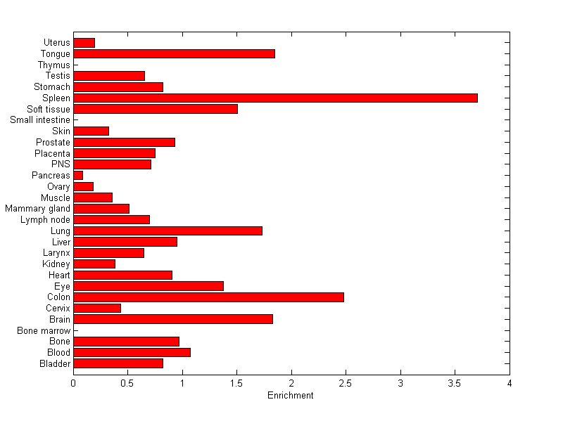 The expression level is normalized with tissue-library size. Each value for a gene in a tissue is a ratio of observed ESTs to the expected one in this tissue. The expected number of ESTs is the product of total ESTs of the gene and the fraction of total ESTs in the tissue among all ESTs in 30 tissues.