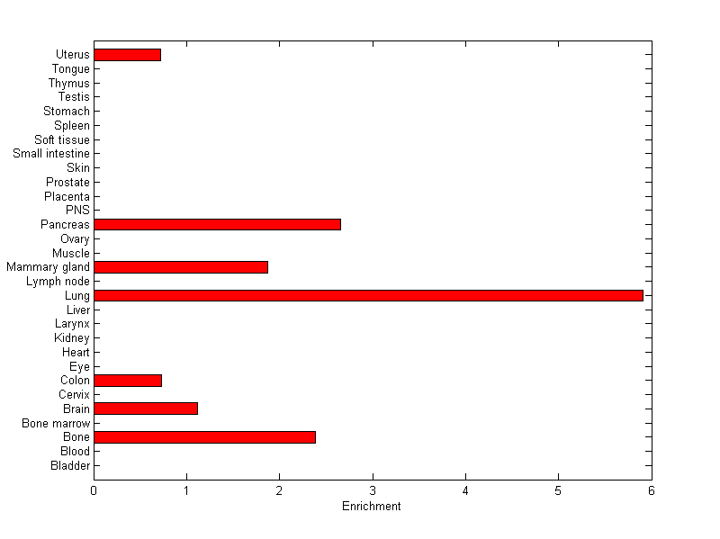 The expression level is normalized with tissue-library size. Each value for a gene in a tissue is a ratio of observed ESTs to the expected one in this tissue. The expected number of ESTs is the product of total ESTs of the gene and the fraction of total ESTs in the tissue among all ESTs in 30 tissues.