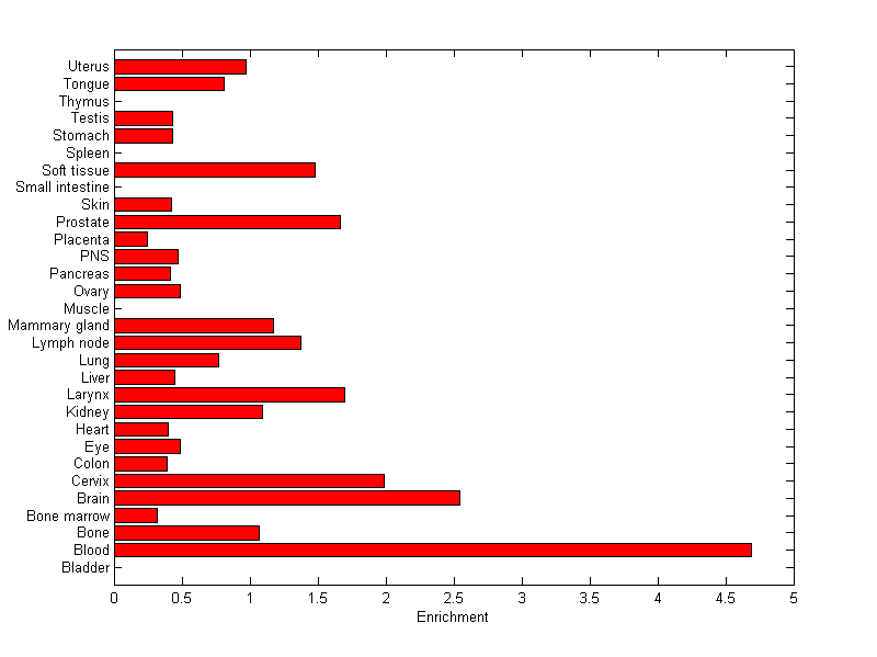 The expression level is normalized with tissue-library size. Each value for a gene in a tissue is a ratio of observed ESTs to the expected one in this tissue. The expected number of ESTs is the product of total ESTs of the gene and the fraction of total ESTs in the tissue among all ESTs in 30 tissues.