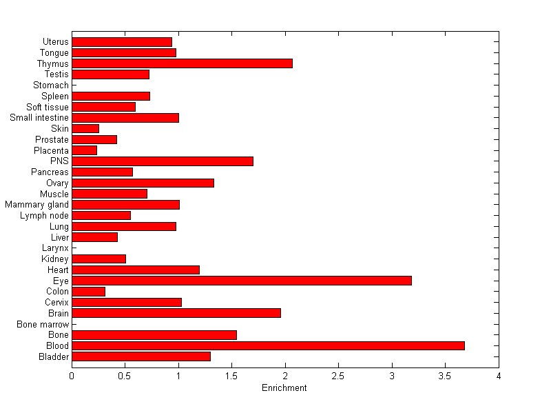 The expression level is normalized with tissue-library size. Each value for a gene in a tissue is a ratio of observed ESTs to the expected one in this tissue. The expected number of ESTs is the product of total ESTs of the gene and the fraction of total ESTs in the tissue among all ESTs in 30 tissues.