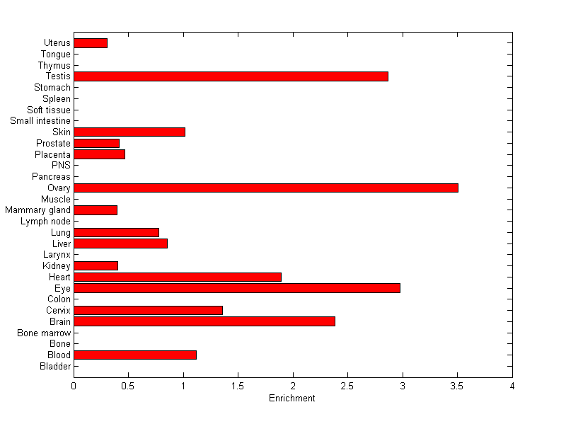 The expression level is normalized with tissue-library size. Each value for a gene in a tissue is a ratio of observed ESTs to the expected one in this tissue. The expected number of ESTs is the product of total ESTs of the gene and the fraction of total ESTs in the tissue among all ESTs in 30 tissues.