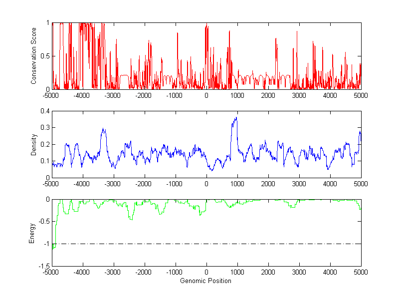 The energy profile (green curve) is about energy for module detection based on TF interaction. The positions with energy less than -1 indicate the existence of CRMs.