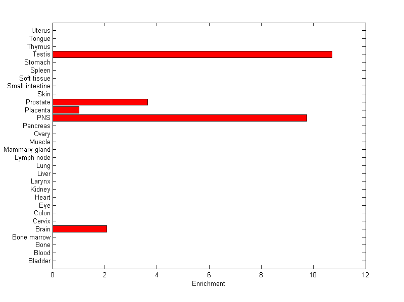 The expression level is normalized with tissue-library size. Each value for a gene in a tissue is a ratio of observed ESTs to the expected one in this tissue. The expected number of ESTs is the product of total ESTs of the gene and the fraction of total ESTs in the tissue among all ESTs in 30 tissues.