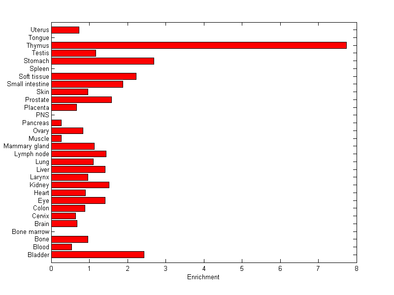 The expression level is normalized with tissue-library size. Each value for a gene in a tissue is a ratio of observed ESTs to the expected one in this tissue. The expected number of ESTs is the product of total ESTs of the gene and the fraction of total ESTs in the tissue among all ESTs in 30 tissues.