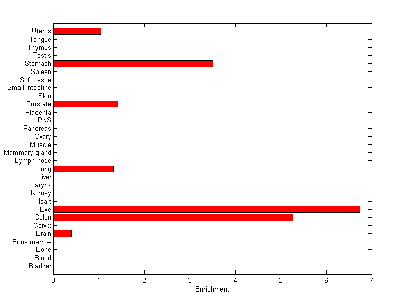The expression level is normalized with tissue-library size. Each value for a gene in a tissue is a ratio of observed ESTs to the expected one in this tissue. The expected number of ESTs is the product of total ESTs of the gene and the fraction of total ESTs in the tissue among all ESTs in 30 tissues.