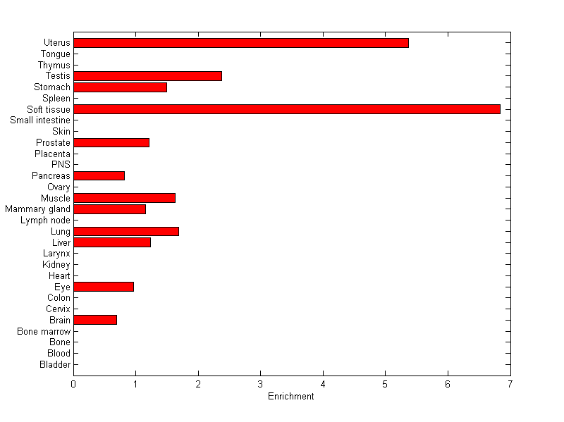 The expression level is normalized with tissue-library size. Each value for a gene in a tissue is a ratio of observed ESTs to the expected one in this tissue. The expected number of ESTs is the product of total ESTs of the gene and the fraction of total ESTs in the tissue among all ESTs in 30 tissues.