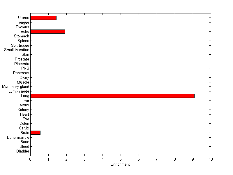 The expression level is normalized with tissue-library size. Each value for a gene in a tissue is a ratio of observed ESTs to the expected one in this tissue. The expected number of ESTs is the product of total ESTs of the gene and the fraction of total ESTs in the tissue among all ESTs in 30 tissues.