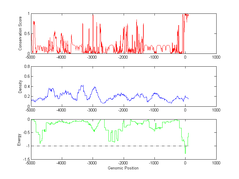 The energy profile (green curve) is about energy for module detection based on TF interaction. The positions with energy less than -1 indicate the existence of CRMs.