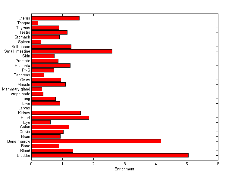 The expression level is normalized with tissue-library size. Each value for a gene in a tissue is a ratio of observed ESTs to the expected one in this tissue. The expected number of ESTs is the product of total ESTs of the gene and the fraction of total ESTs in the tissue among all ESTs in 30 tissues.