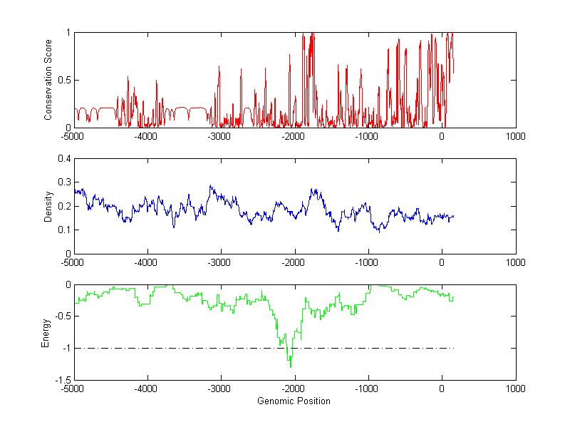 The energy profile (green curve) is about energy for module detection based on TF interaction. The positions with energy less than -1 indicate the existence of CRMs.