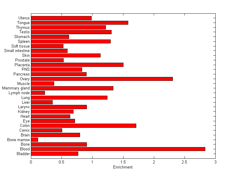 The expression level is normalized with tissue-library size. Each value for a gene in a tissue is a ratio of observed ESTs to the expected one in this tissue. The expected number of ESTs is the product of total ESTs of the gene and the fraction of total ESTs in the tissue among all ESTs in 30 tissues.