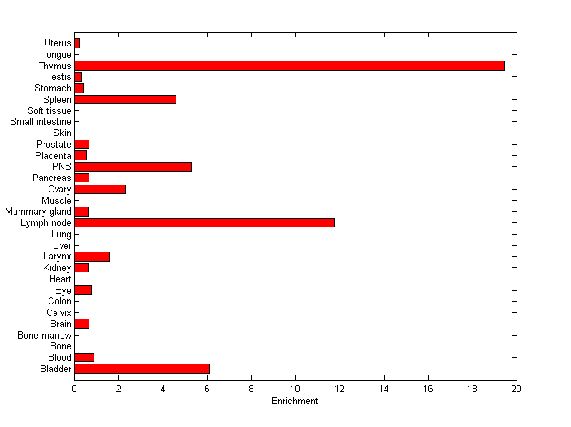 The expression level is normalized with tissue-library size. Each value for a gene in a tissue is a ratio of observed ESTs to the expected one in this tissue. The expected number of ESTs is the product of total ESTs of the gene and the fraction of total ESTs in the tissue among all ESTs in 30 tissues.