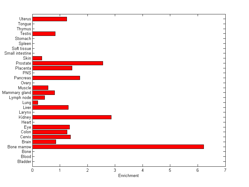 The expression level is normalized with tissue-library size. Each value for a gene in a tissue is a ratio of observed ESTs to the expected one in this tissue. The expected number of ESTs is the product of total ESTs of the gene and the fraction of total ESTs in the tissue among all ESTs in 30 tissues.