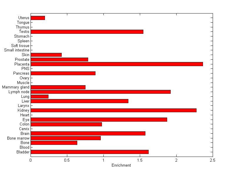 The expression level is normalized with tissue-library size. Each value for a gene in a tissue is a ratio of observed ESTs to the expected one in this tissue. The expected number of ESTs is the product of total ESTs of the gene and the fraction of total ESTs in the tissue among all ESTs in 30 tissues.