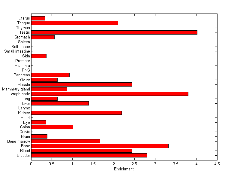 The expression level is normalized with tissue-library size. Each value for a gene in a tissue is a ratio of observed ESTs to the expected one in this tissue. The expected number of ESTs is the product of total ESTs of the gene and the fraction of total ESTs in the tissue among all ESTs in 30 tissues.