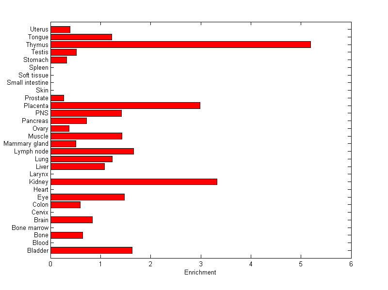 The expression level is normalized with tissue-library size. Each value for a gene in a tissue is a ratio of observed ESTs to the expected one in this tissue. The expected number of ESTs is the product of total ESTs of the gene and the fraction of total ESTs in the tissue among all ESTs in 30 tissues.