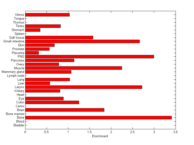 The expression level is normalized with tissue-library size. Each value for a gene in a tissue is a ratio of observed ESTs to the expected one in this tissue. The expected number of ESTs is the product of total ESTs of the gene and the fraction of total ESTs in the tissue among all ESTs in 30 tissues.